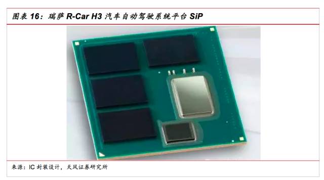 汽車電子是SiP的重要應用場景。汽車電子里的SiP應用正在逐漸增加。以發(fā)動機控制單元(ECU)舉例,ECU由微處理器(CPU)、存儲器(ROM、RAM)、輸入/輸出接口(I/O)、模數轉換器(A/D)以及整形、驅動等大規(guī)模集成電路組成。各類型的芯片之間工藝不同,目前較多采用SiP的方式將芯片整合在一起成為完整的控制系統(tǒng)。另外,汽車防抱死系統(tǒng)(ABS)、燃油噴射控制系統(tǒng)、安全氣囊電子系統(tǒng)、方向盤控制系統(tǒng)、輪胎低氣壓報警系統(tǒng)等各個單元,采用SiP的形式也在不斷增多。此外,SIP技術在快速增長的車載辦公系統(tǒng)和娛樂系統(tǒng)中也獲得了成功的應用。