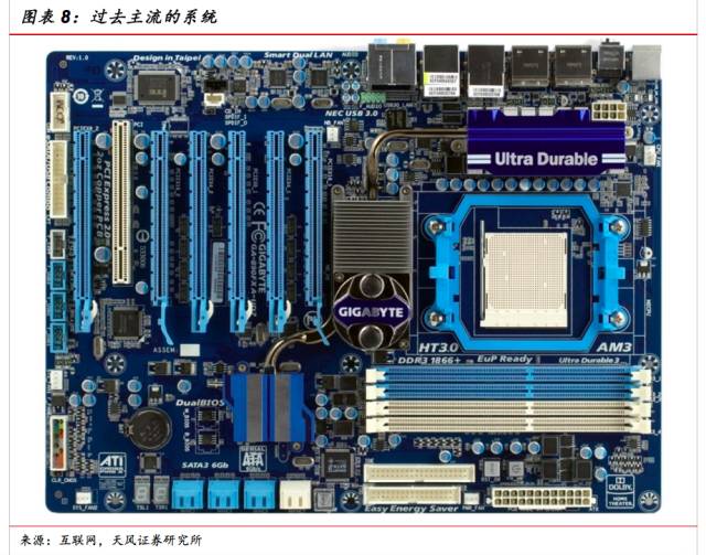 PCB板并不遵從摩爾定律,是整個系統(tǒng)性能提升的瓶頸。與芯片規(guī)模不斷縮小相對應的是,PCB板這些年并沒有發(fā)生太大變化。舉例而言,PCB主板的標準最小線寬從十年前就是3 mil(大約75 um),到今天還是3 mil,幾乎沒有進步。畢竟,PCB并不遵從摩爾定律。因為PCB的限制,使得整個系統(tǒng)的性能提升遇到了瓶頸。比如,由于PCB線寬都沒變化,所以處理器和內存之間的連線密度也保持不變。換句話說,在處理器和內存封裝大小不大變的情況下,處理器和內存之間的連線數量不會顯著變化。而內存的帶寬等于內存接口位寬 乘以內存接口操作頻率。內存輸出位寬等于處理器和內存之間的連線數量,在十年間受到PCB板工藝的限制一直是64bit沒有發(fā)生變化。所以想提升內存帶寬只有提高內存接口操作頻率。這就限制了整個系統(tǒng)的性能提升。