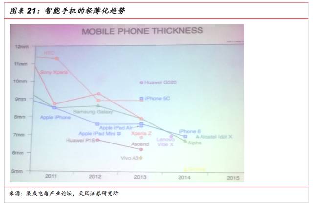 手機輕薄化帶來SiP需求增長。手機是SiP封裝最大的市場。隨著智能手機越做越輕薄,對于SiP的需求自然水漲船高。從2011-2015,各個品牌的手機厚度都在不斷縮減。輕薄化對組裝部件的厚度自然有越來越高的要求。以iPhone 6s為例,已大幅縮減PCB的使用量,很多芯片元件都會做到SiP模塊里,而到了iPhone8,有可能是蘋果第一款全機采用SiP的手機。這意味著,iPhone8一方面可以做得更加輕薄,另一方面會有更多的空間容納其他功能模塊,比如說更強大的攝像頭、揚聲器,以及電池。
