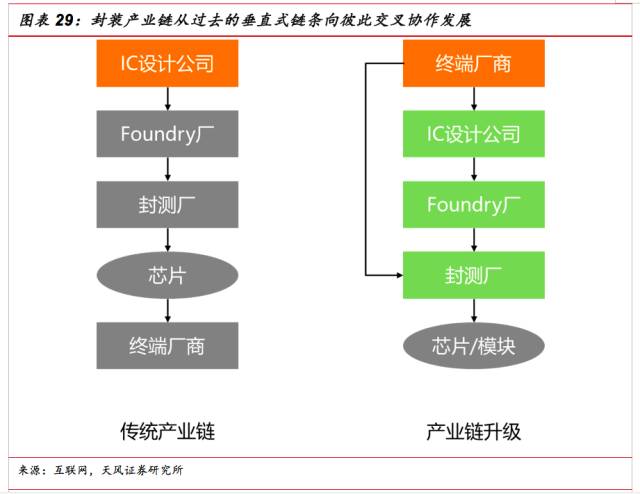 從產業(yè)鏈的變革、產業(yè)格局的變化來看,今后電子產業(yè)鏈將不再只是傳統(tǒng)的垂直式鏈條:終端設備廠商——IC設計公司——封測廠商、Foundry廠、IP設計公司,產品的設計將同時調動封裝廠商、基板廠商、材料廠、IC設計公司、系統(tǒng)廠商、Foundry廠、器件廠商(如TDK、村田)、存儲大廠(如三星)等彼此交叉協作,共同實現產業(yè)升級。未來系統(tǒng)將帶動封裝業(yè)進一步發(fā)展,反之高端封裝也將推動系統(tǒng)終端繁榮。未來系統(tǒng)廠商與封裝廠的直接對接將會越來越多,而IC設計公司則將可能向IP設計或者直接出售晶圓兩個方向去發(fā)展。